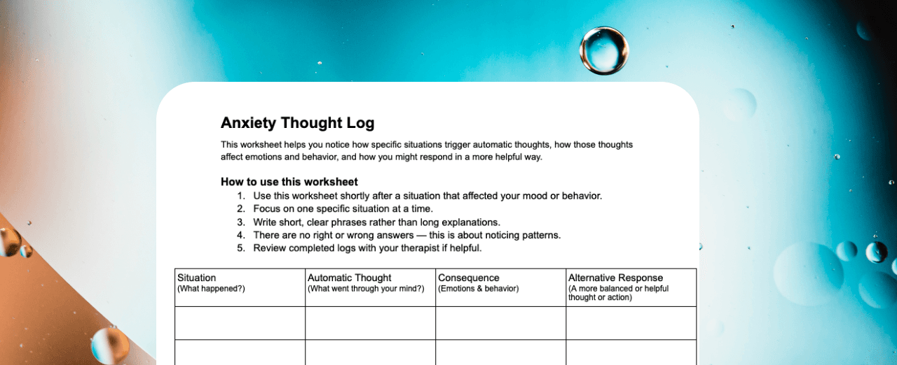 This worksheet helps clients capture real-life anxiety moments in a clear, structured way—without writing down every thought. Clients briefly describe the situation, note the first automatic thought, record the emotional/behavioral consequence (including what they did or avoided), and then practice a realistic alternative response (not overly positive). Use it as homework to build awareness, bring concrete examples into session, and support cognitive and behavioral change over time.