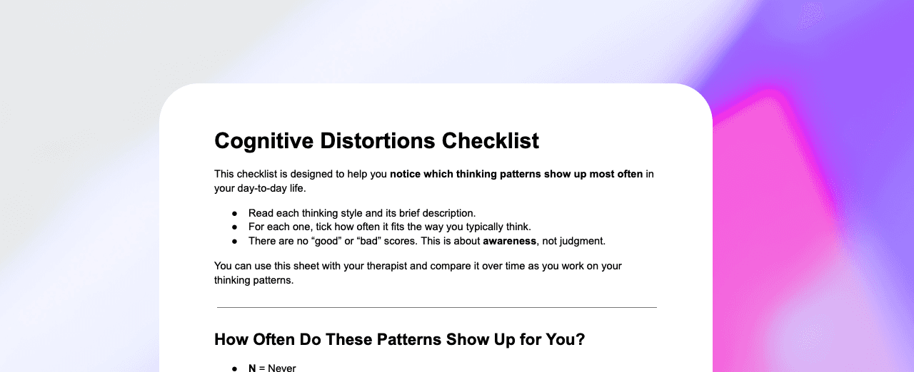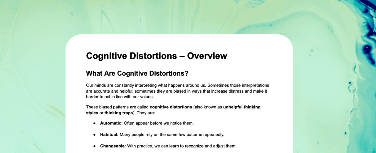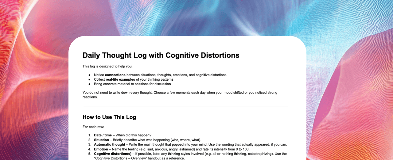 Cognitive distortions are common thinking patterns that can intensify low mood, anxiety, and avoidance. This download gives therapists a structured set of CBT tools to help clients spot their “thinking traps,” understand how they show up day-to-day, and practice more balanced alternatives. Use the overview and checklist to build shared language quickly, then move into daily tracking and guided reflection to strengthen insight and skill-building between sessions.