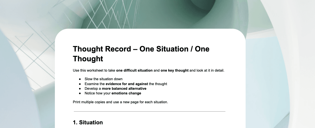 A daily CBT log to capture situations, automatic thoughts, emotions, and cognitive distortions—plus space for a more balanced alternative.