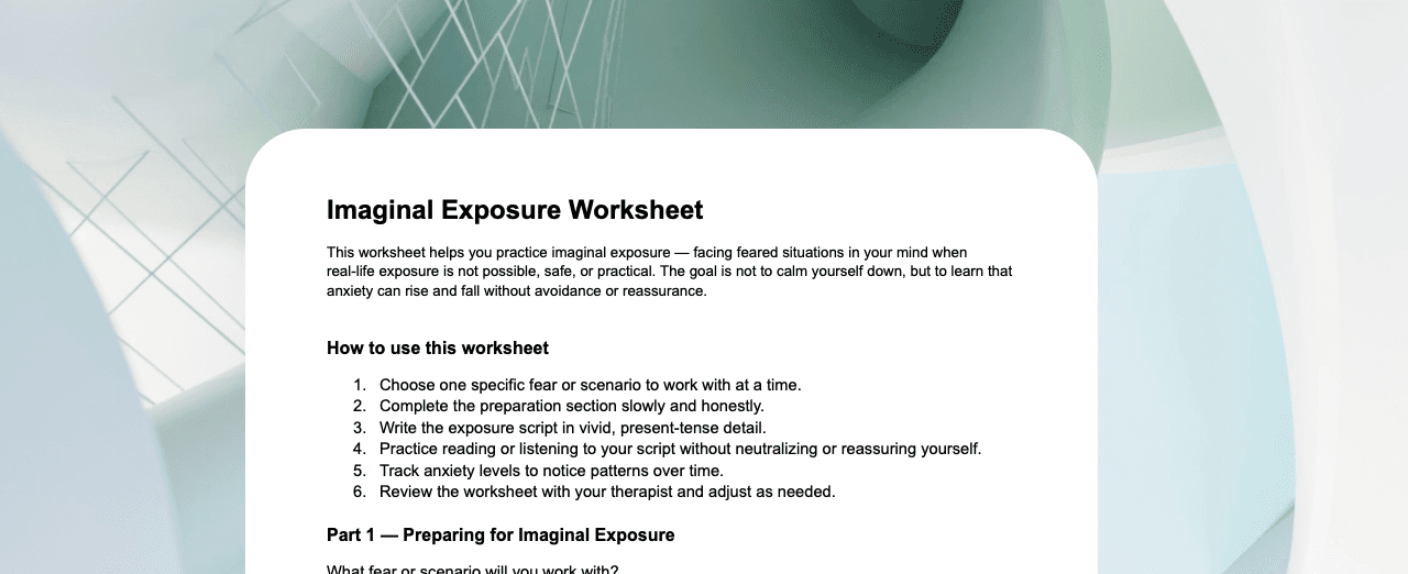 This worksheet supports exposure work when real-life exposure isn’t possible, safe, or practical. Clients choose one fear scenario, complete preparation prompts (sensations, images, meanings), and then write an exposure script in vivid, present-tense detail. They practice reading or listening to the script while tracking anxiety over time, learning that anxiety can rise and fall without avoidance, reassurance, or other neutralizing behaviors. Ideal for structured imaginal exposure homework and session planning.