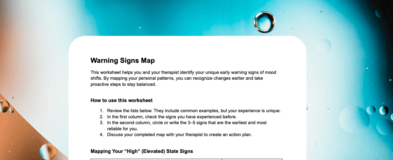 This worksheet helps clients and therapists map personalized early warning signs so changes are recognized sooner and addressed proactively. Clients review common signs, check what they’ve experienced before, and then circle or write the 3–5 earliest and most reliable indicators for them. The map covers both “high/elevated” signs and “low/depressive” signs, supporting clearer self-awareness and more timely intervention. Use it for relapse prevention, maintenance planning, and creating a concrete action plan when early signs appear.