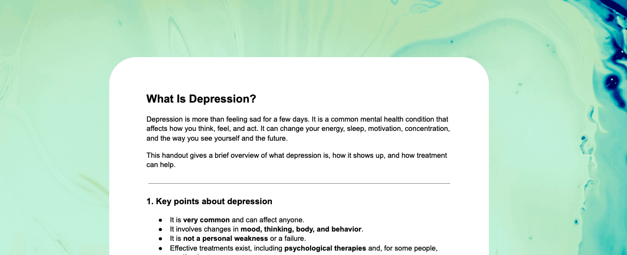 This handout explains depression beyond “feeling sad,” highlighting how it can affect mood, thinking, energy, sleep, motivation, and daily functioning. It includes key points to reduce shame and self-blame, outlines common symptoms in accessible language, and introduces factors that can contribute to depression. Use it in early sessions for psychoeducation, normalization, and collaborative treatment planning.