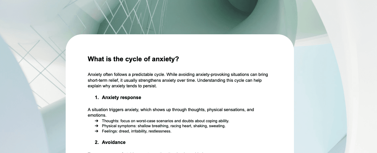 This handout teaches clients why anxiety often persists by breaking down the predictable loop that reinforces it. It explains how anxious thoughts, body sensations, and emotions lead to avoidance, how avoidance brings short-term relief, and why that relief strengthens anxiety over time. Use it early in treatment to build insight, reduce self-blame, and introduce the rationale for gradual approach, exposure, and skills practice.